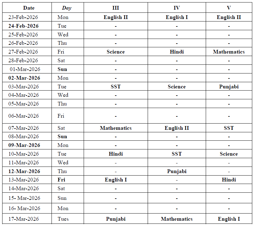 Datesheet for Final Examination – March 2026 (Classes III to V)